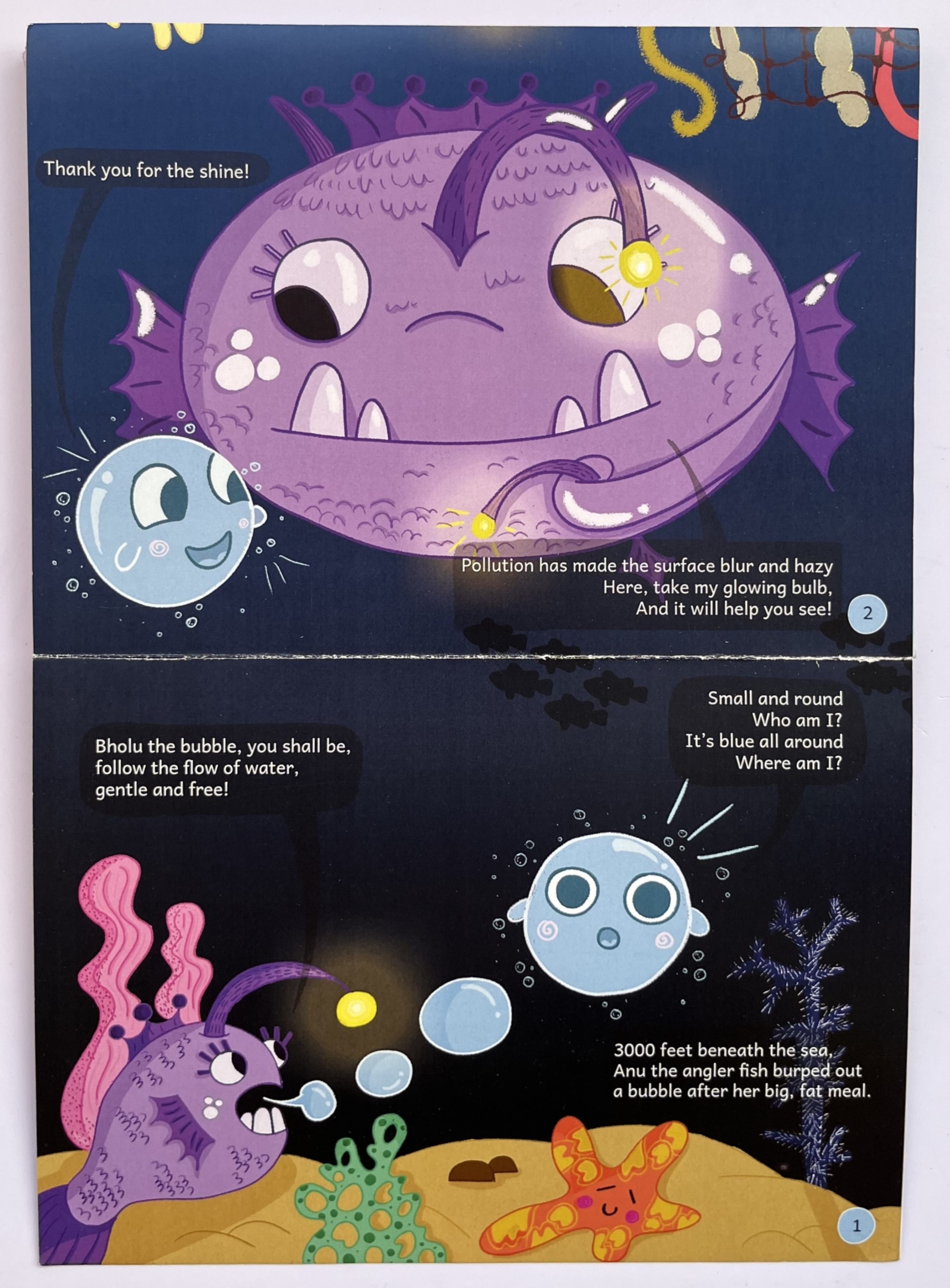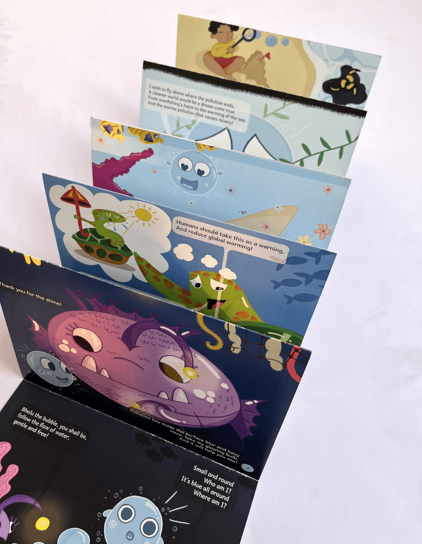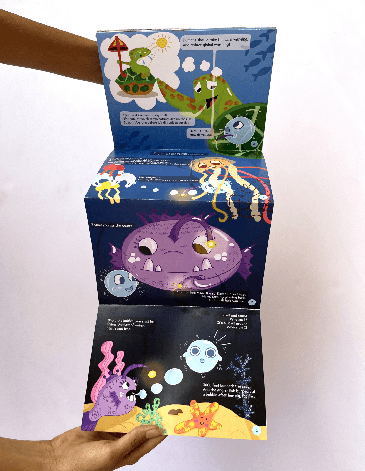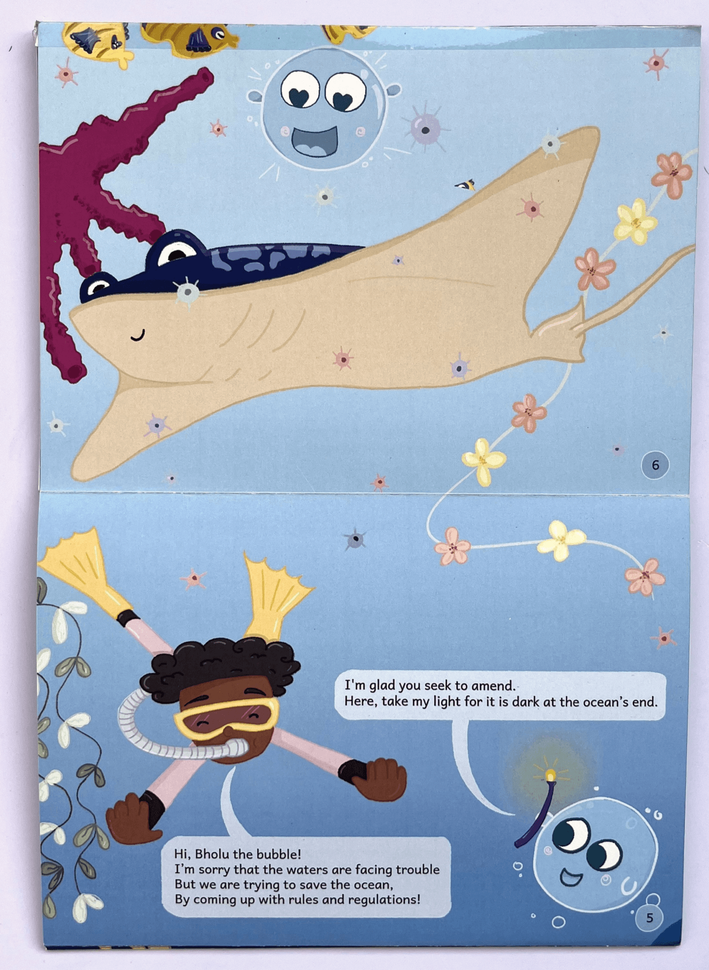 The story follows Bholu, a bubble, as he meets sea creatures on his journey from the ocean floor to the surface. Through rhyming conversations, the book introduces kids to marine life challenges in a simple, engaging way.