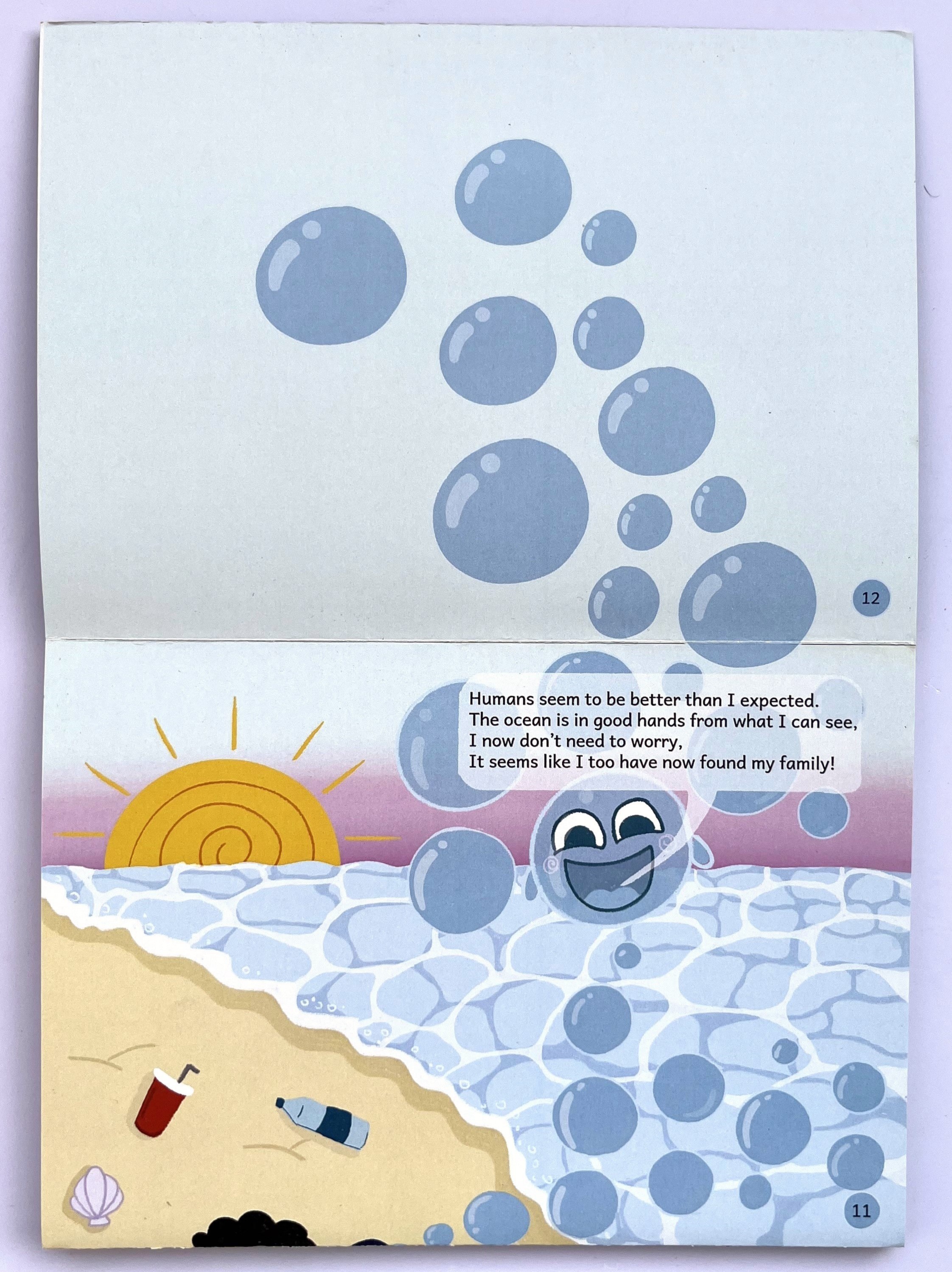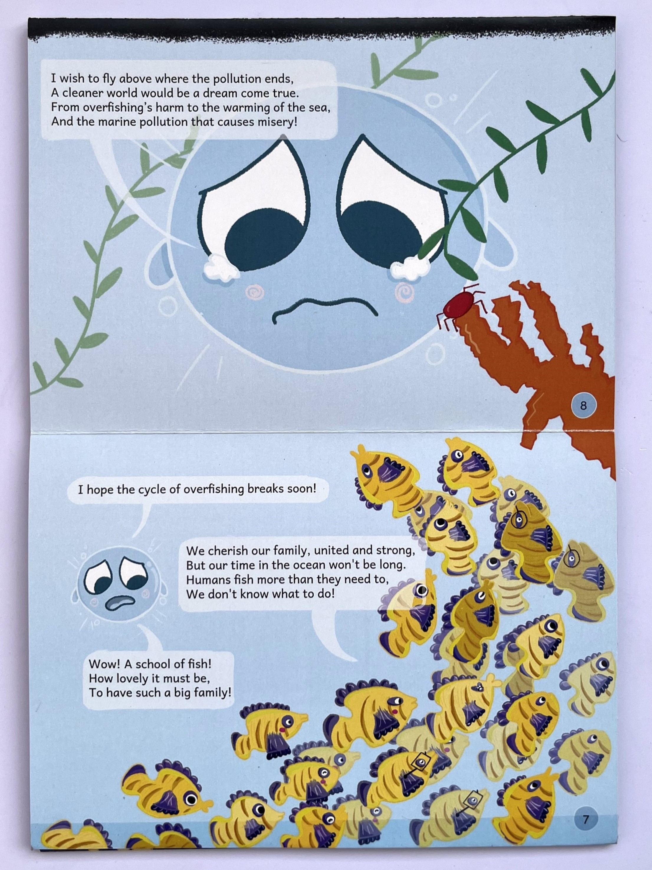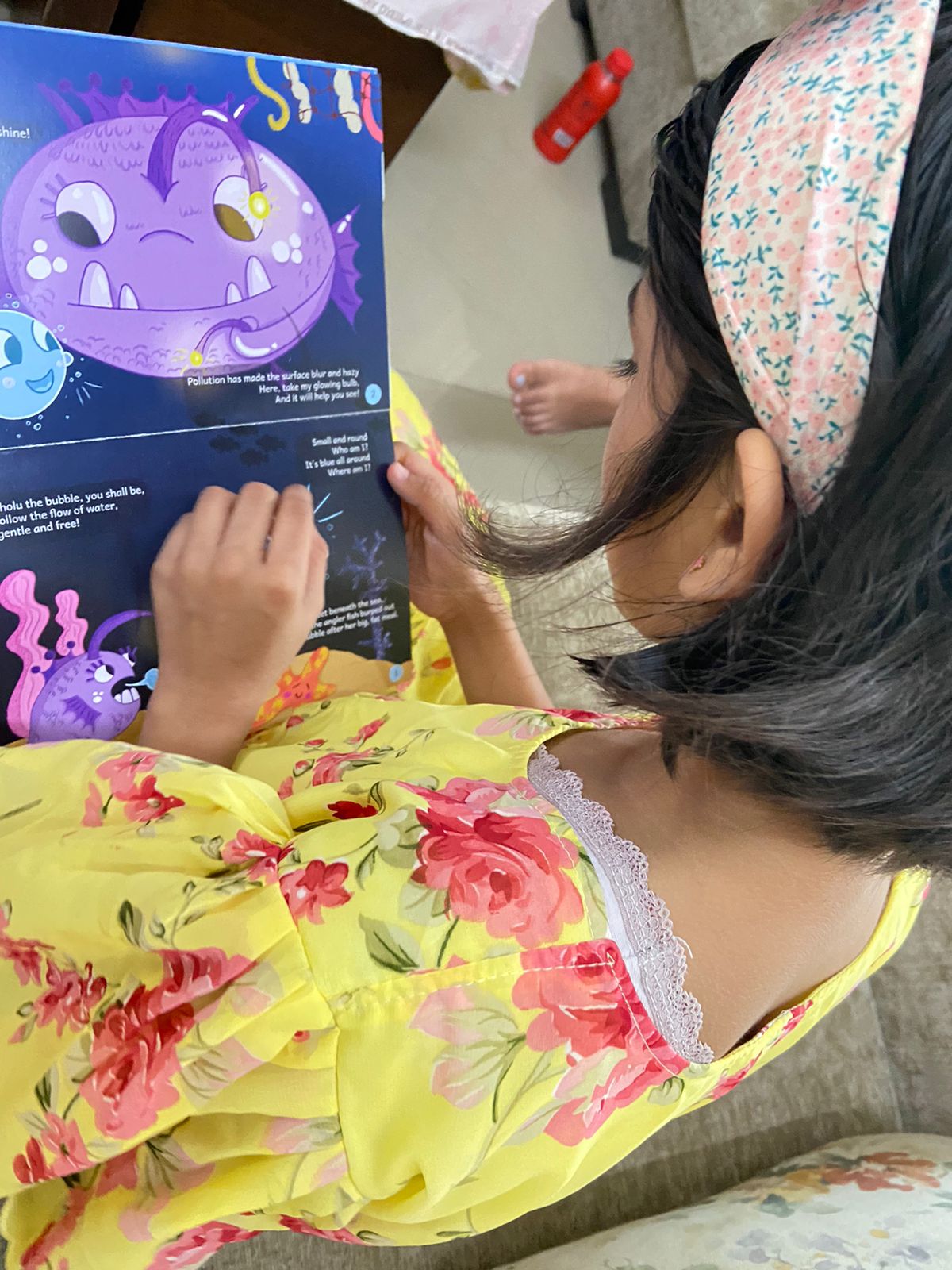 The story follows Bholu, a bubble, as he meets sea creatures on his journey from the ocean floor to the surface. Through rhyming conversations, the book introduces kids to marine life challenges in a simple, engaging way.