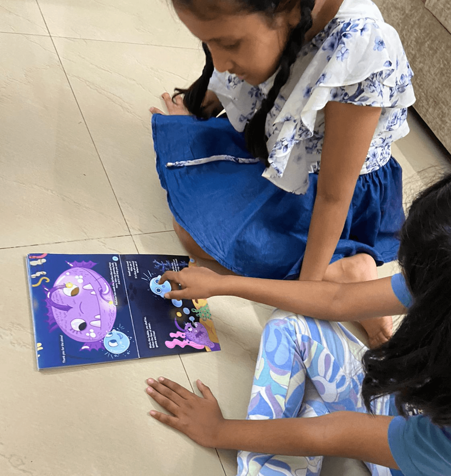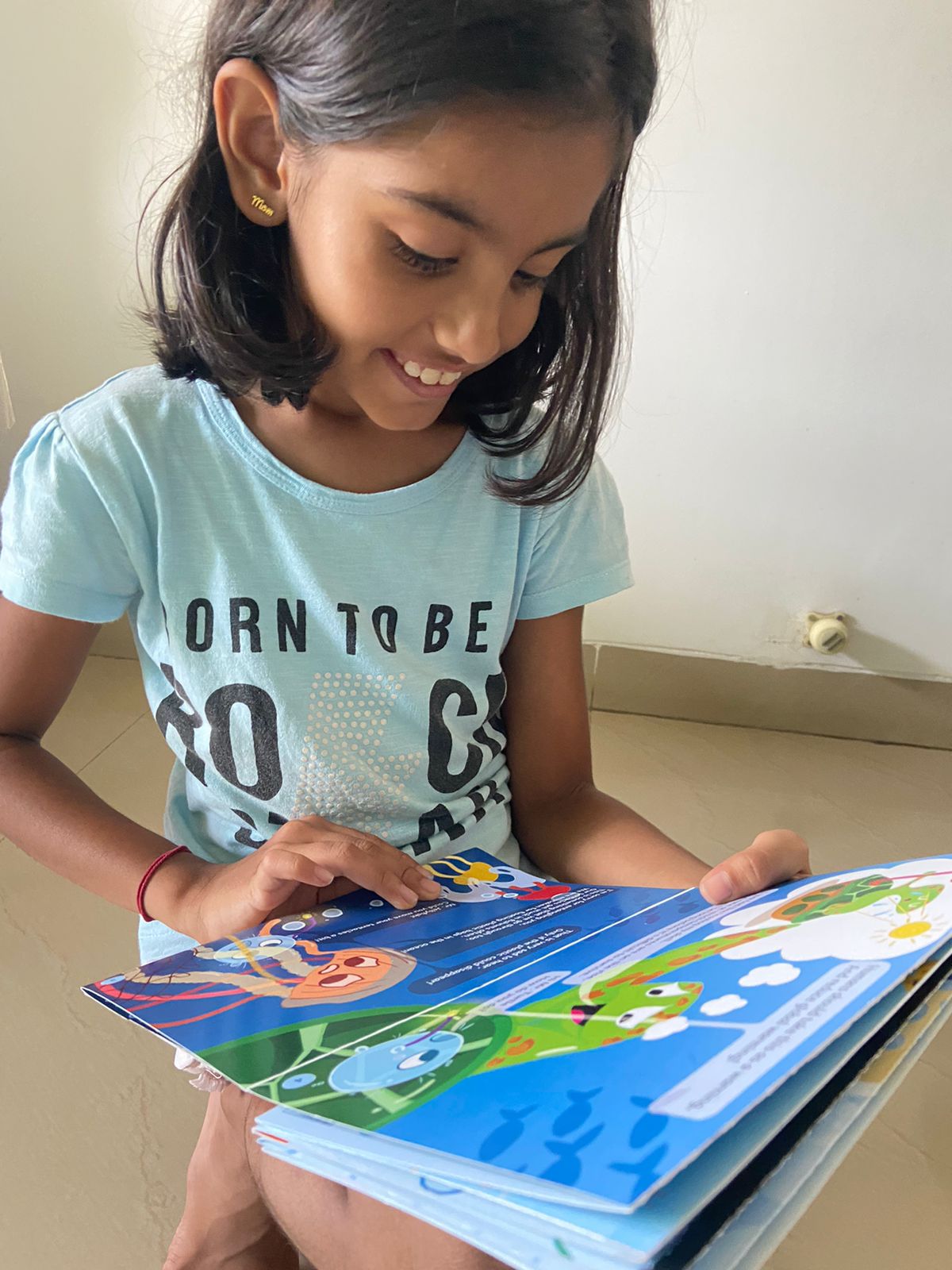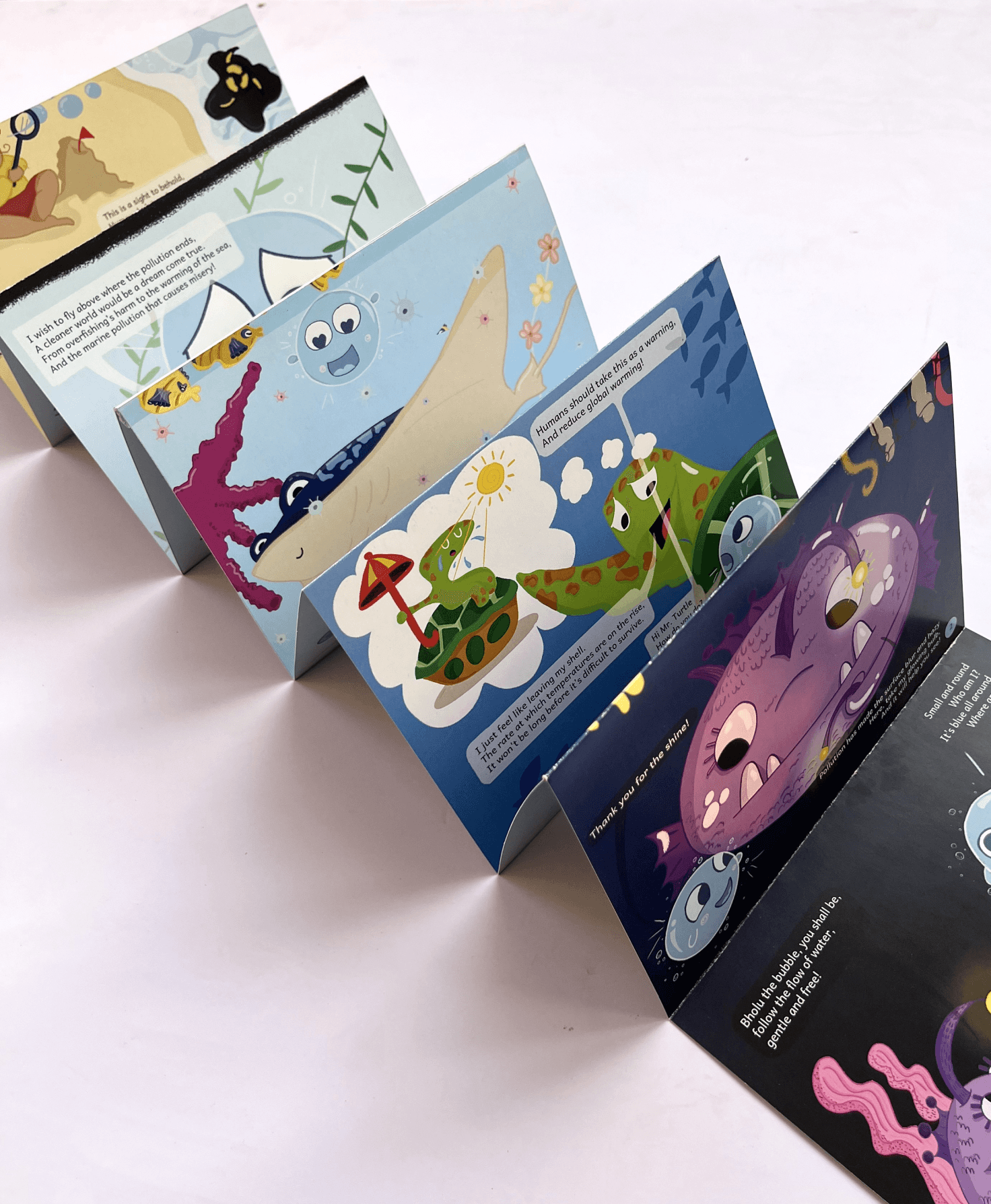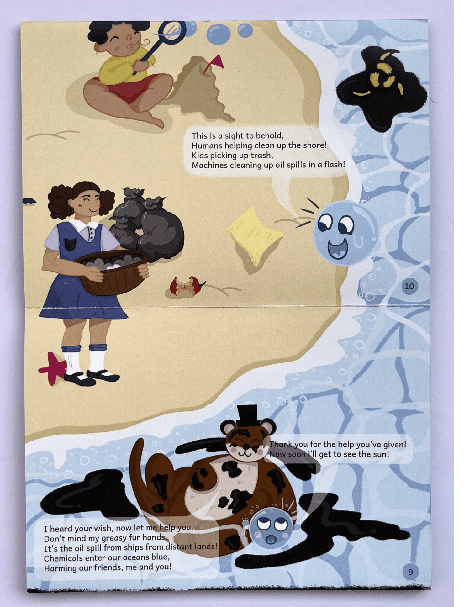 The story follows Bholu, a bubble, as he meets sea creatures on his journey from the ocean floor to the surface. Through rhyming conversations, the book introduces kids to marine life challenges in a simple, engaging way.